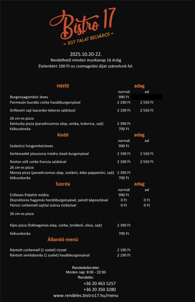 Ebédmenü a Bistro17-ben Kedves Vendégeink! Menünket munkanapokon 16 óráig megrendelheted, vagy 15 óráig az étteremben is elfogyaszthatod. Asztalfoglalás Házhoz szállítás